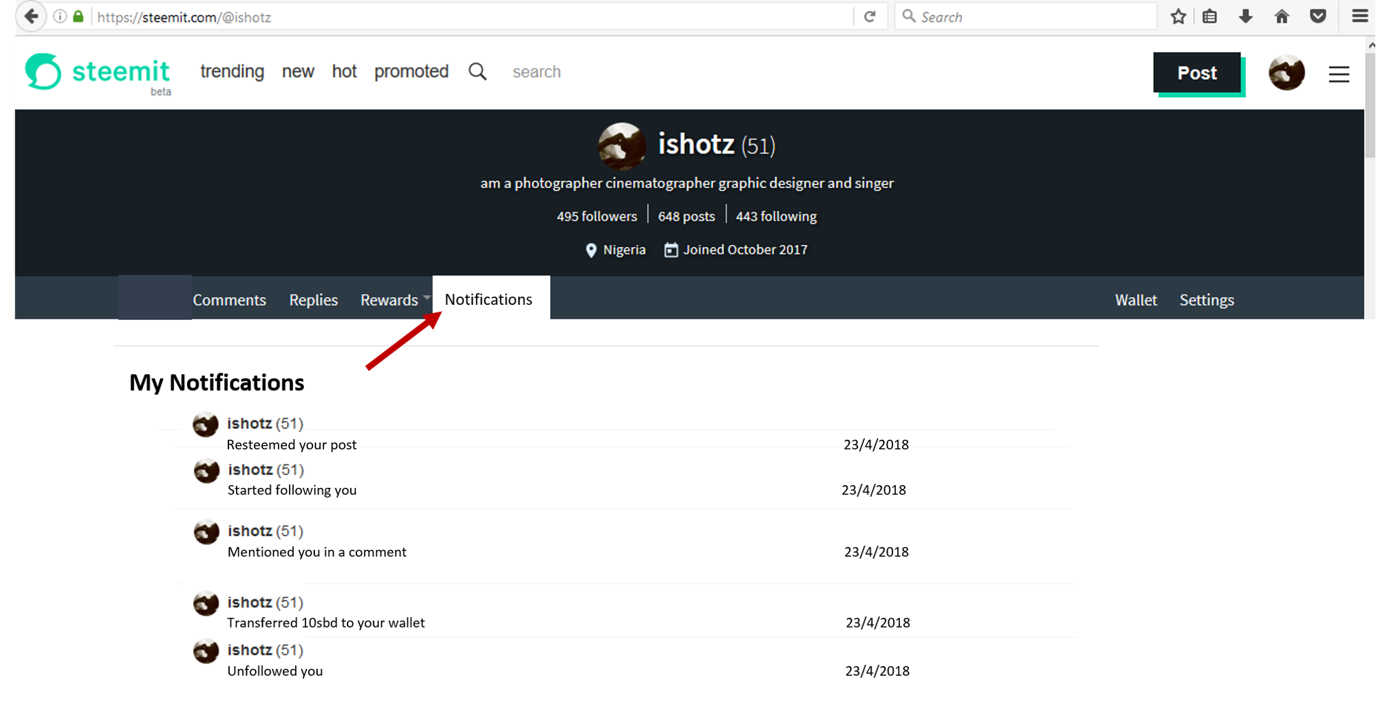 Addition of Notification tab on steemit.com