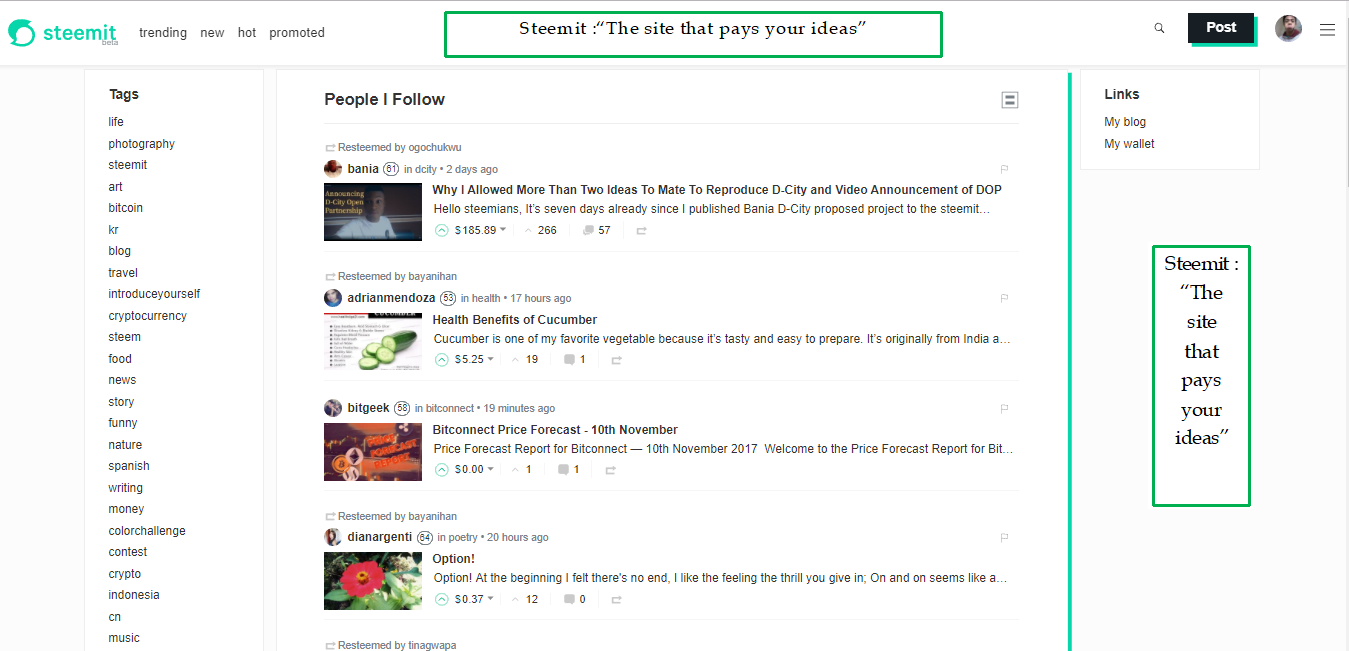 I would love to suggest that the Tagline should be visible as always, no matter what page they are into. I believe the power of that catchy little slogan, it could help boost the advertising and visibility of Steemit platform. Steemit is a very unique type of platform and if marketed properly, it will be a big boost to attract investors and new users.