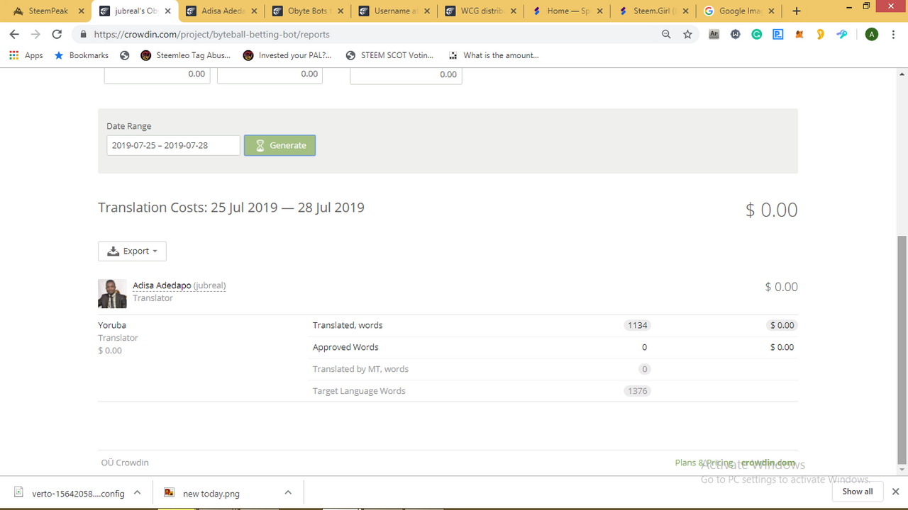According to my estimations, I translated a total of 1,134 words (July 25th - July 28th) in the Obyte bot project as shown in the picture below