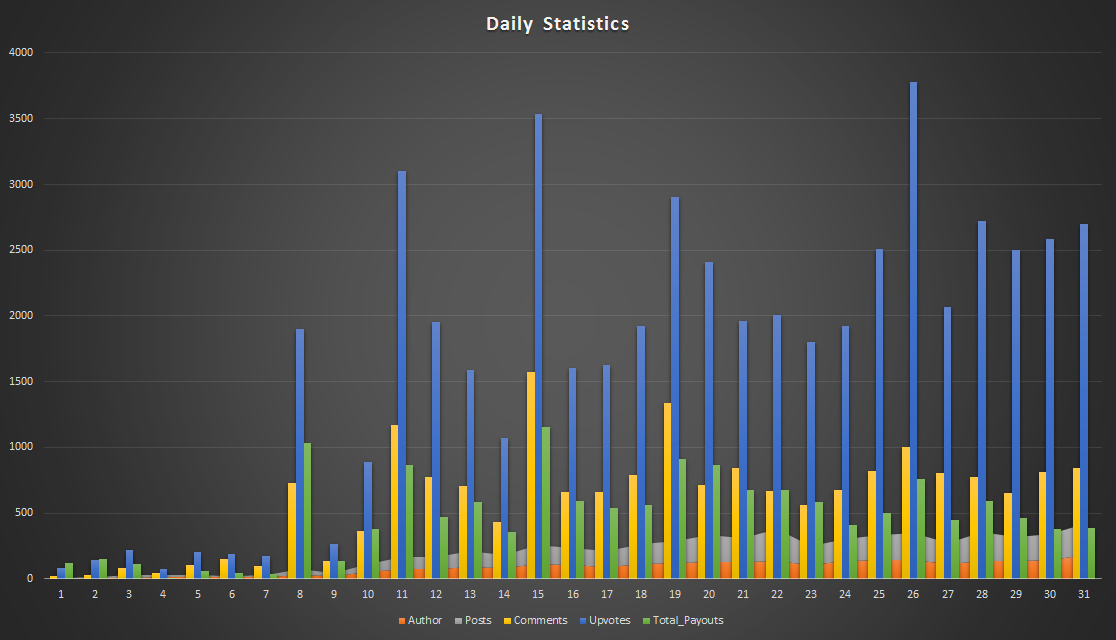 in terms of no. of authors, post, sum of total payout, comments, and upvotes.