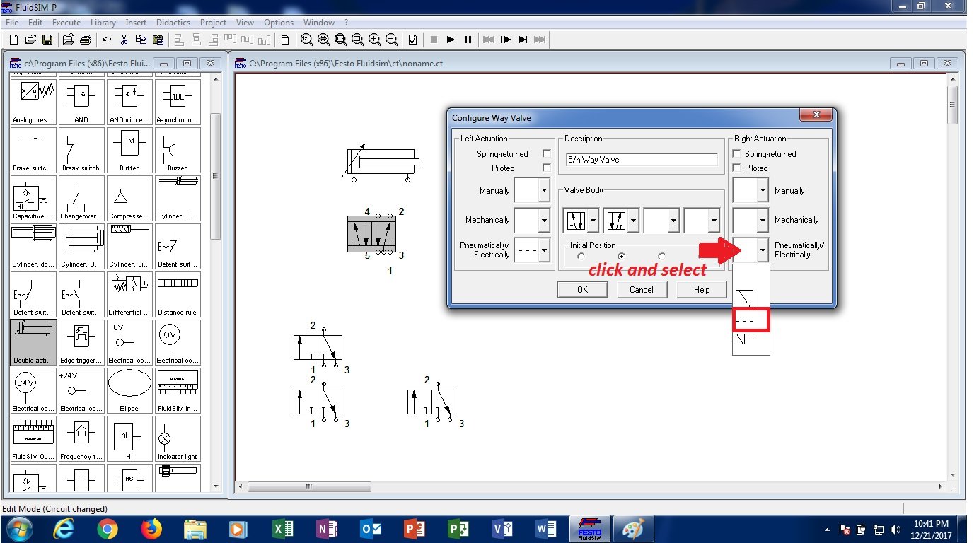 To finish the configuration of the 5/2 way DCV, put the terminal designation number for the pneumatic actuation of the 5.2 way DCV. Follow the procedure as indicated in the figure below. Double click the 5/2 way DCV first before a dialog box appears.