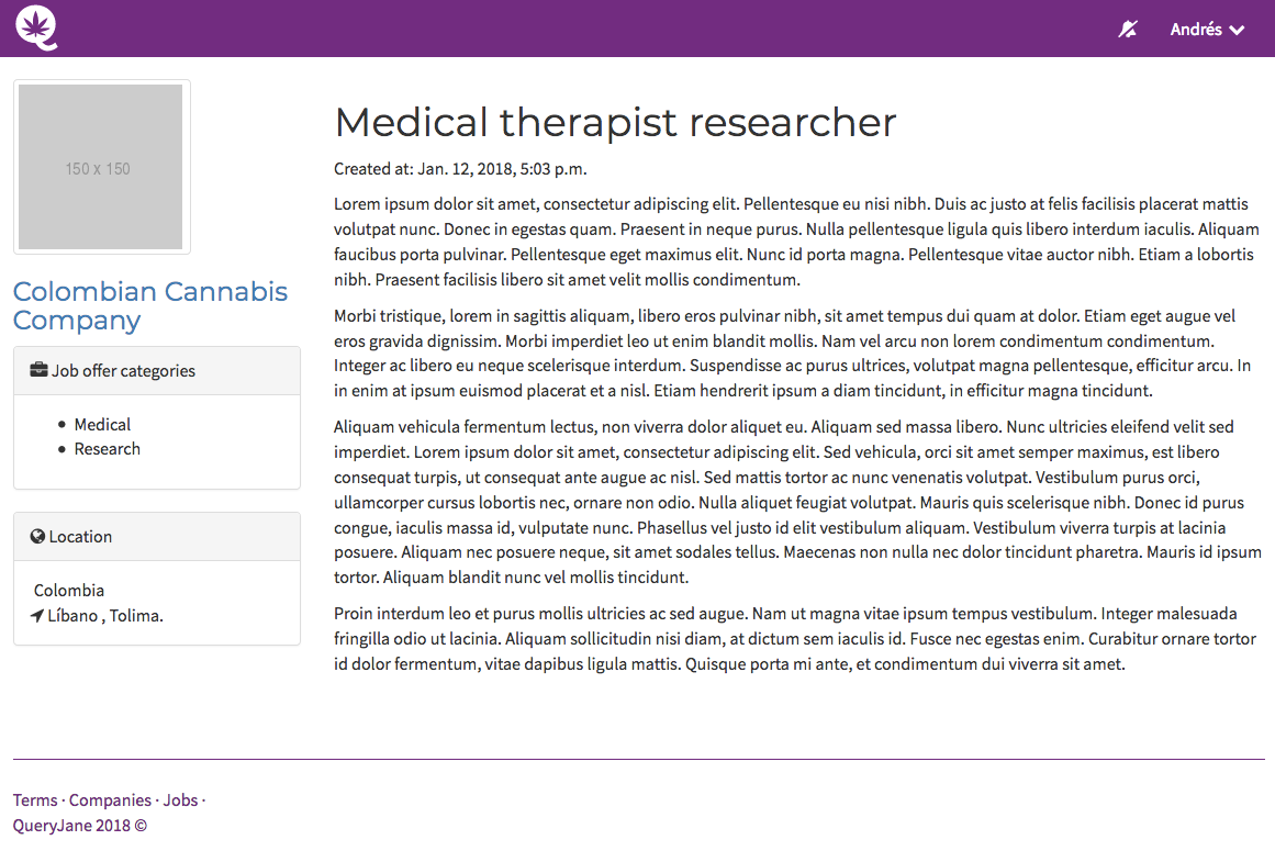 QueryJane is a web application developed with Django that allows to connect with companies and experts in different sectors of the cannabis industry. I have launched the beta version recently. In this opportunity I will add a new functionality that will allow companies to create job offers.