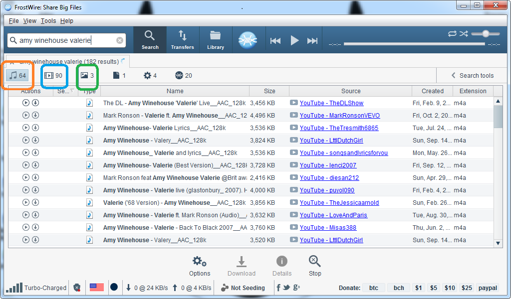 Öncelikle Arayüzü sizlere tanıtmak isterim.Turuncu renkle işaretlediğim bölümde istediğimiz dökümanları (müzik,video,fotoğraf,vbz..) aratmak için ''Search'' butonuna tıklıyoruz.Yeşil ile işaretlediğim yer ise,''Transfers'' yani indirilmekte veya inmiş dosyalarımızın çalışma yeridir.Son olarak Mavi renkle işaretlediğim yer ise bizim ''Library'' yani kütüphanemizde bulun dökümanlardır.