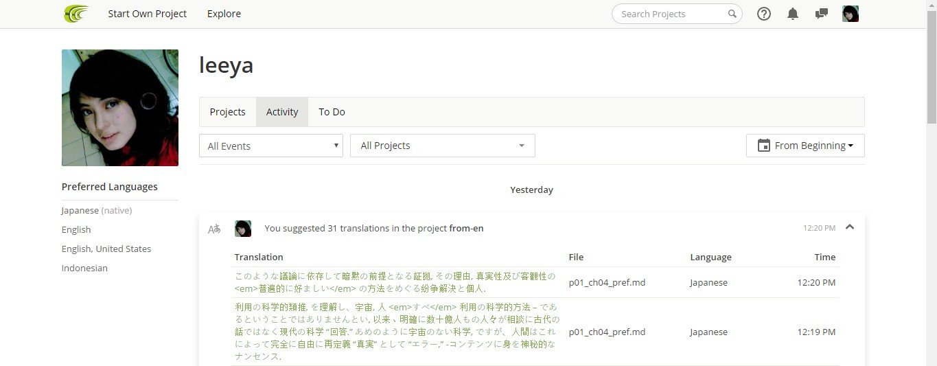 Well, here are some screenshots of my work proof at crowdin.com with from-en project.