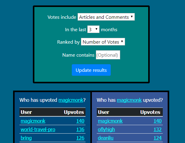 All other features of the program have tested to still work, such as the upvote stats and the rankings, accessible by typing your user name and clicking the Upvote Stats or the Ranking buttons on the main page.