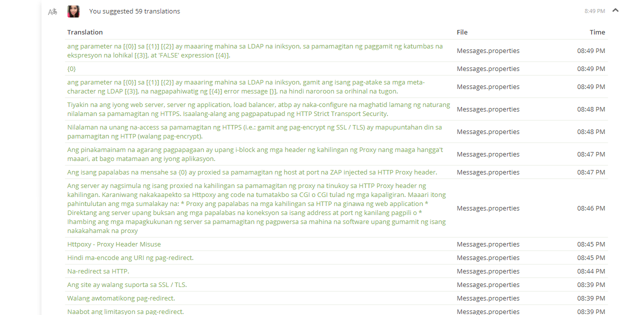 You may check my activity on this link: https://crowdin.com/project/owasp-zap/fil/activity