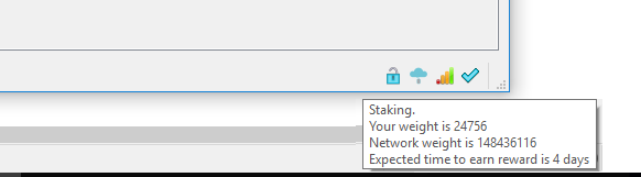 Once the waiting period has passed you'll be able to see the estimated time until you can get a reward. Hover your mouse over the rain cloud in the bottom right corner to get this information. If the time seems unreasonably long don't get discouraged yet. This will continue to decrease as your coins "age". This will increase your wallet's network weight, and lessen the time for you to stake.