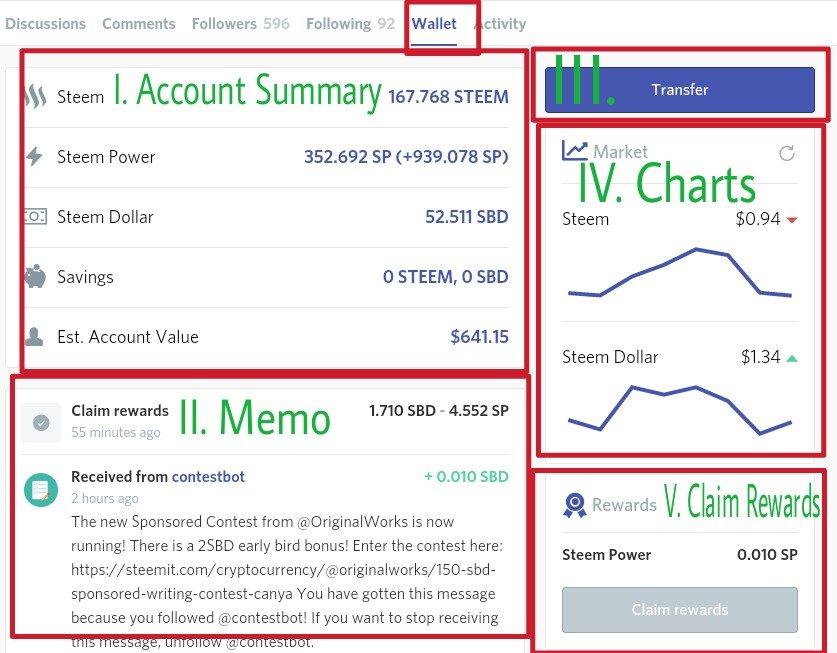 Here you can see the balances of your currencies including STEEM, STEEM POWER & SBD. You can also do transactions to put money into your SAVINGS.II- MEMO:
