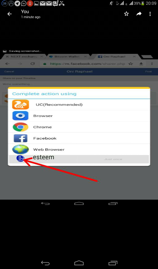 Below is the screen shot of the suggested behavior of the app when, implemented. There is an arrow pointing to the position where the esteem app icon would be, when steemit link is clicked. Such that when icon is clicked, it will open on esteem app for use.