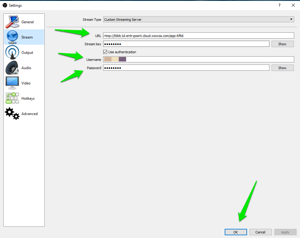 Encoder authentication kısmında yazan bilgileri obs ayarlar kısmında doğru yazdığınızdan emin olun
