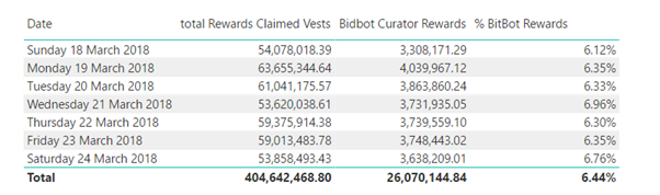 All curation rewards are paid in vest or SP. Only author rewards are paid in SBD. Now that I know how much was sent to the bidbot businesses I wanted to see what % of actual SBD rewards claimed were sent back to bidbots.