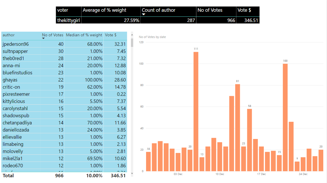 With 956 votes to 287 different authors, @thekittygirl has voted with an average 27.5% weight. The value of these votes which can be attributed to Stella’s delegation is $346.51.