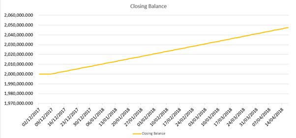 When the founder account votes, they earn curation rewards, which increases their DTMT’s daily balance (as seen in the closing balance chart below). This in turn increase their vote worth, which then also impacts their curation rewards.