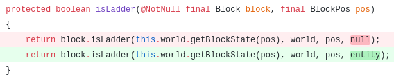 One of the first bugs which were being reported was that ladder checks can break if we give a null entity (certain mods require the entity in the ladder check).