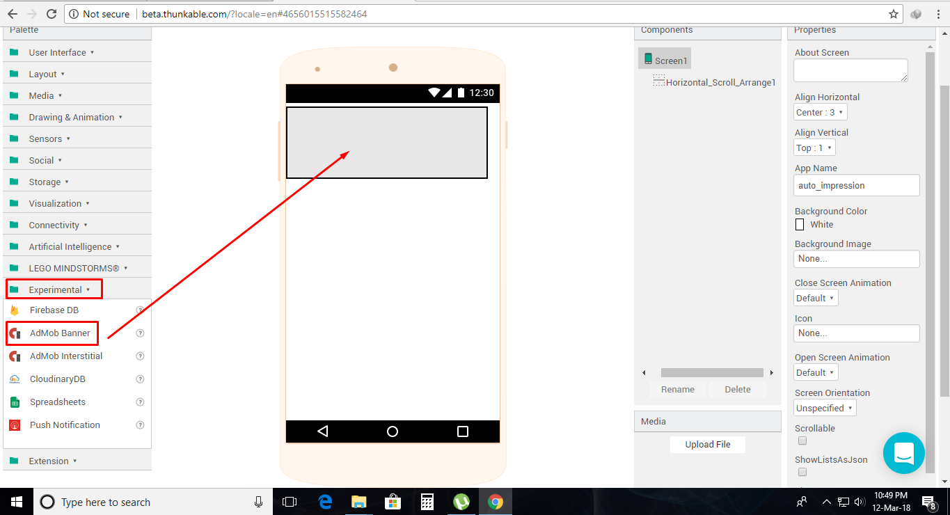Now go to Experimental and drag admob banner in Horizontal Arrange.