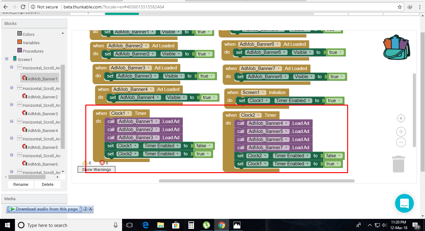 Now go to clock again and drag when do clock 1 Timer. Then call admob banner. Call first 3 like this screen shot. then add set clock 1 timer enable to False. And set clock 1 timer enable to true. Again do same But this time for clock 2. call remaining admob banner and set clock 2 timer enable to False and set clock 1 timer enable to true. You have done. Now just export this app and install you will see the result. I am providing aia file so that you can easily check what I did. Click here to download aia file
