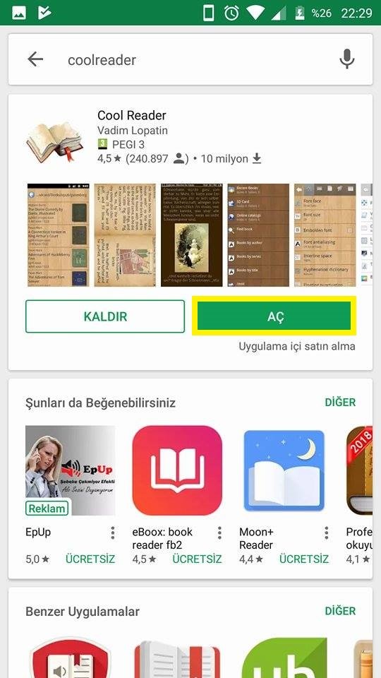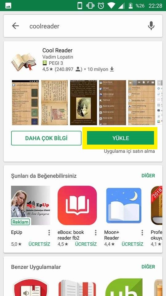 Google Play'a Coolreader yazıp taratıyoruz ve karşımıza çıkan bu programın yükle butonuna tıklıyoruz.