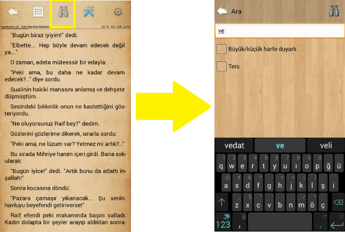 Sarı kutu içerisindeki menü ''kelime arama''dır. Kitabın içerisinden istediğiniz kelimeyi taratabilirsiniz.