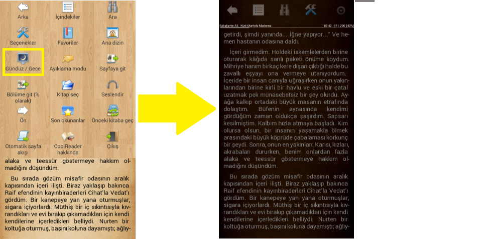 Sarı kutu içerisindeki menü ''Güngüz/gece'' dir. Özellikle geceleri kitap okurken gözümüz çok yorulur hele bu kağıt üstünden değil de teknolojik bir cihazdansa gözlerimizin rahatsız olmaması kaçınılmazdır. Evet Steemit'in gece modu olduğu gibi Coolreader'in de gece modu mevcut. Bu özellik en sevdiğim özellikler arasında yer almakta, eminim ki siz de seveceksiniz.