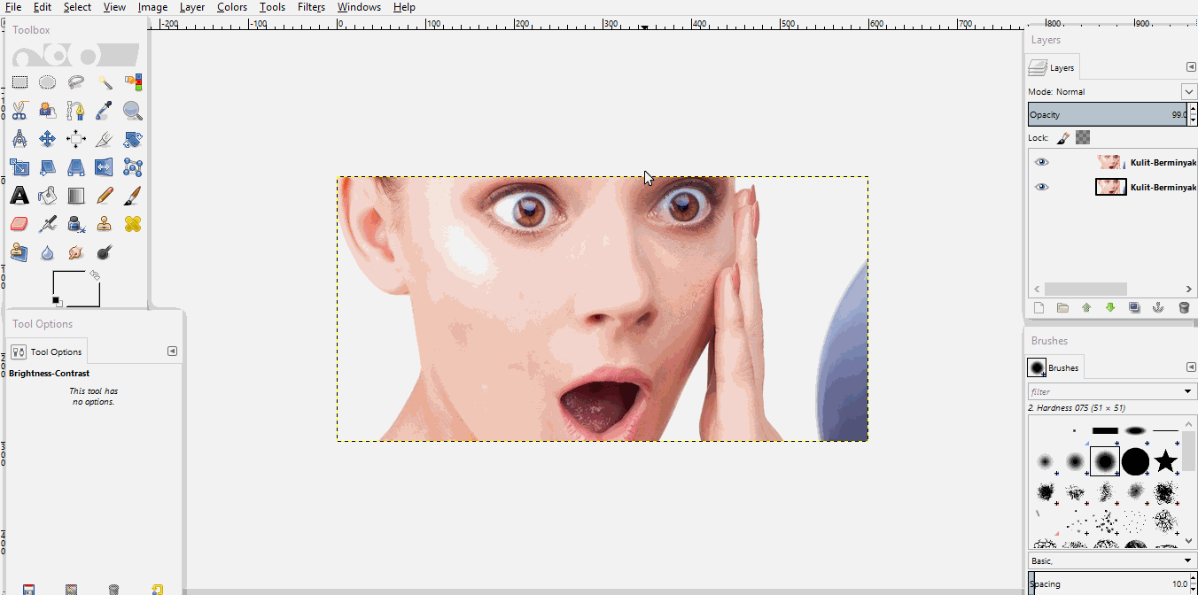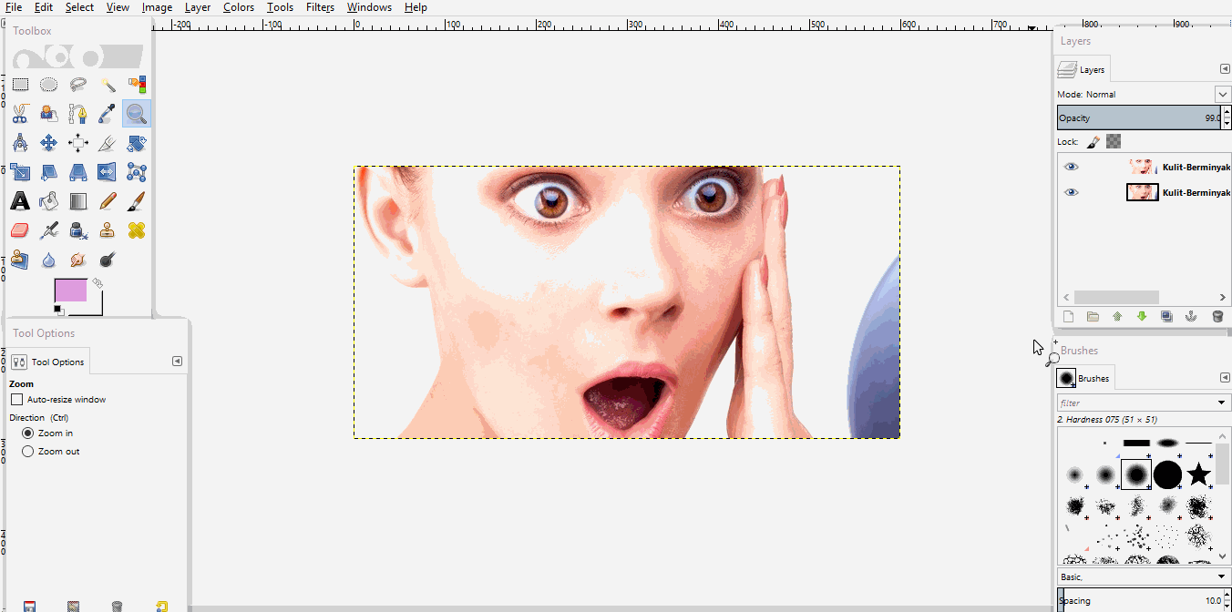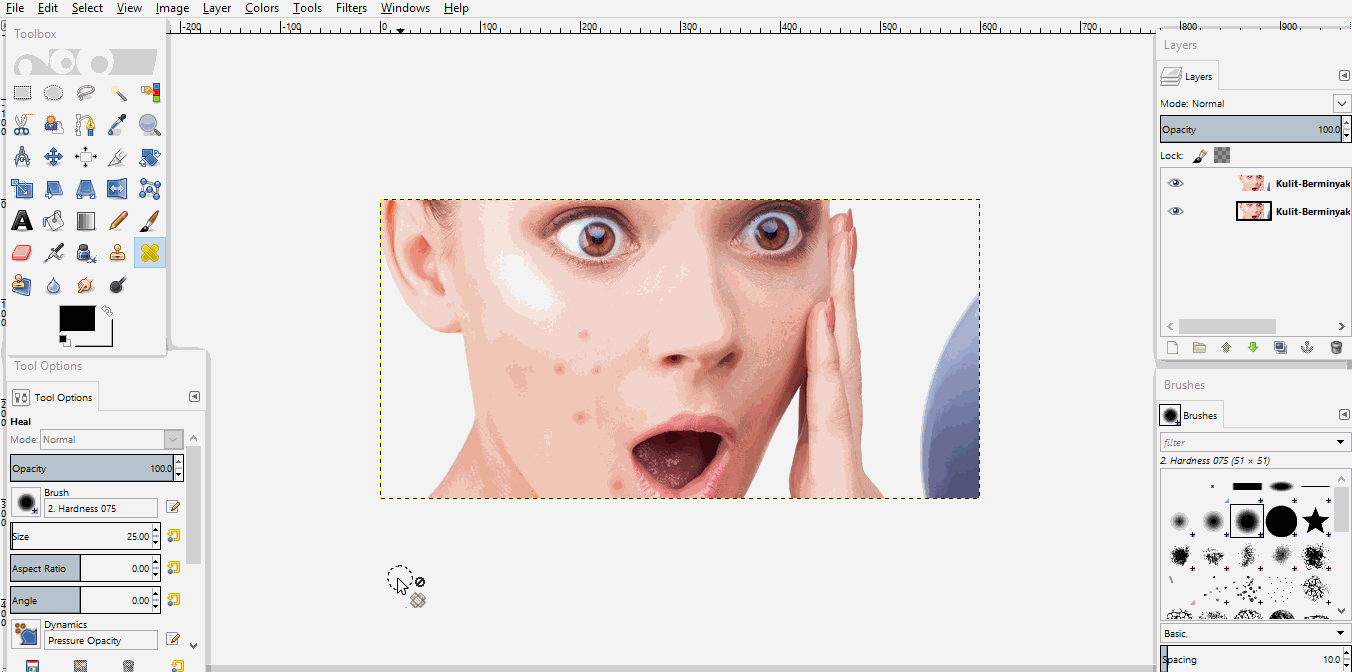 - Duplicate layer > Click Icon Helling Tool in the Toolbox, and then adjust the size for your convenience in the selection, Selection of position may be located in a clean place then click the CTRL on the keyboard of your PC, after that you can click on the position that you want to clear.