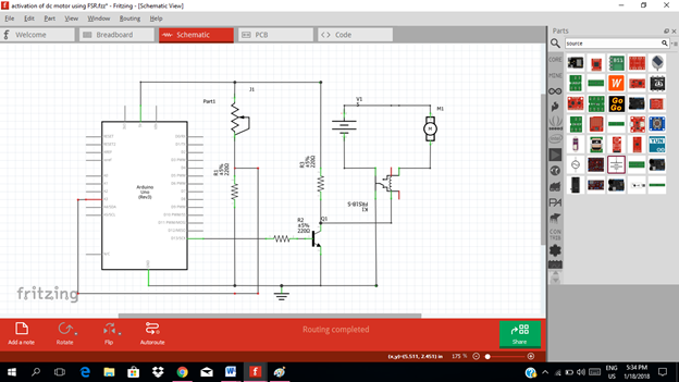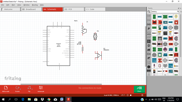- Select the electronic components needed for the circuit in the fritzing library.