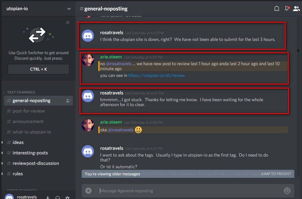 So a couple of days ago, I decided to go to the Discord Chat Room to find out what is wrong. At that time, I was submitting a post and waited for a long time, perhaps 5 or 6 hours and still could not submit my post. I chatted with one of the Utopian moderator.