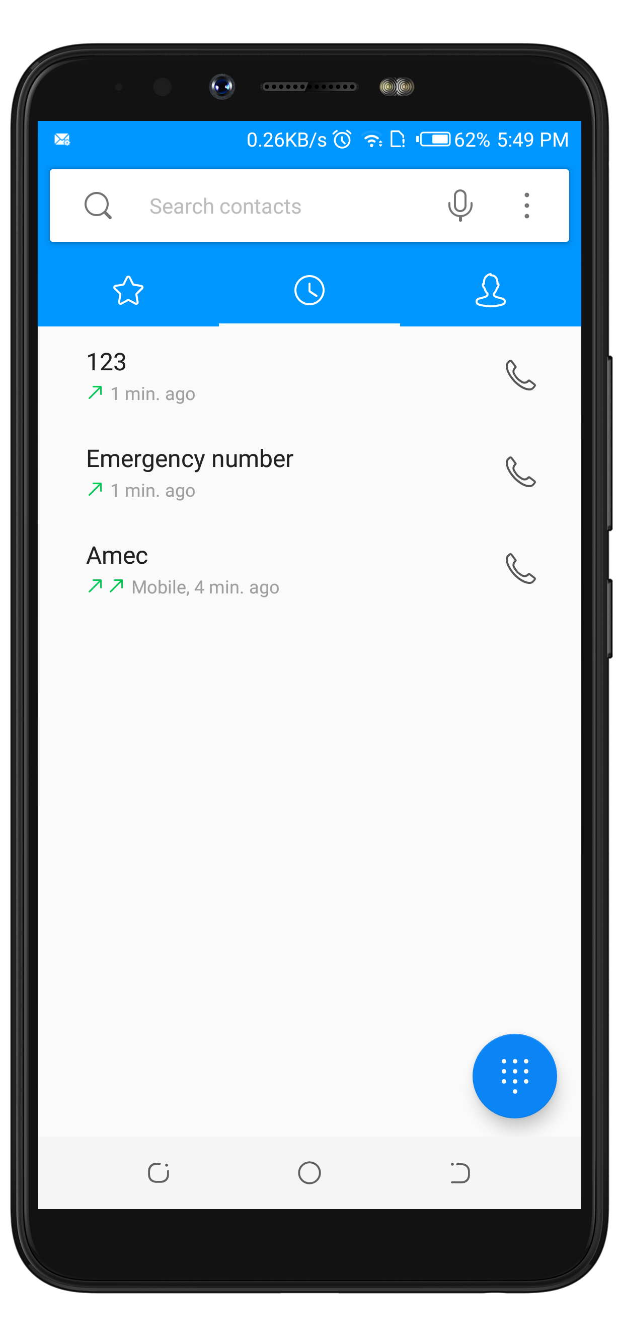 After I accepted those permissions, The page from this screenshot displayed. As you've seen, the user interface is clean and beautiful. There are no unwanted buttons or text displayed. This page is known as the Recent interface. Its function is to save my call history. I haven't received or placed any call that's which why it's empty. You'll get to see how clean it'd still look when it displays my calls history. From this page, I was able to view the title of other interfaces. It was at this point I noticed that the developer made use of my favorite color as the background for the tabs. In case you're wondering what my favorite color is, It's Green.