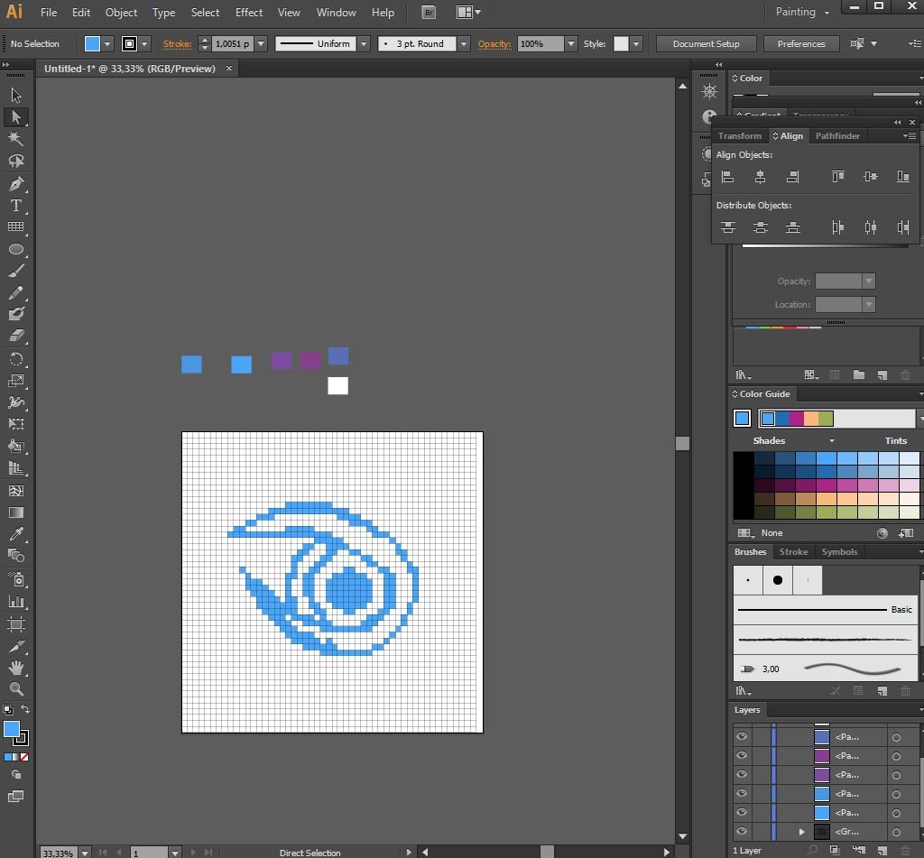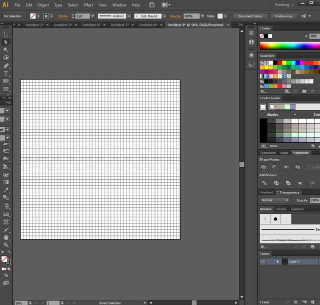 First I made a new 1000x1000px file and made a grid that allows me to color each individual square however I want and gave it a 1pt stroke so that I can see it.