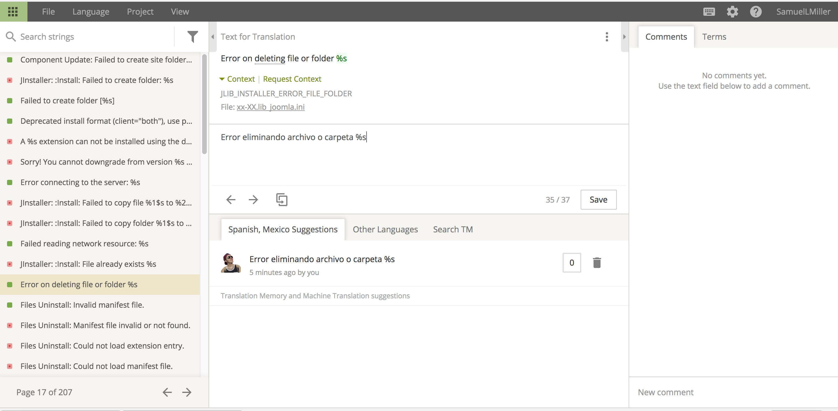 I translated from English to Spanish, Mexico (42% yet to translate)
