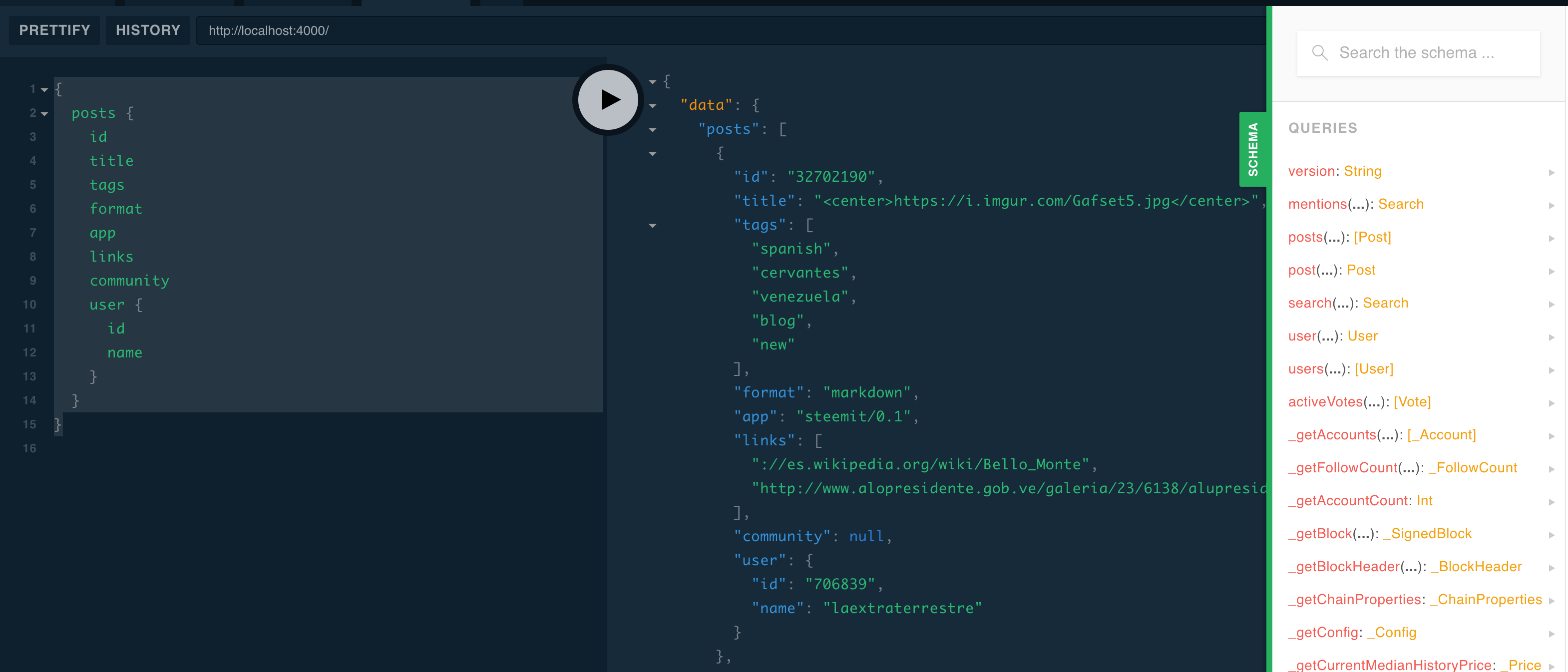 A new update for steemql is out. This one adds the ability to vote and query votes for posts. Hence all basic features to interact (posting, commenting, voting) are available now. As an extra benefit, the json_metadata field of posts is now parsed and the standard fields like image, tags, links etc. are now returned as a direct property of posts. If the don't exist, null is returned. No need to deal with that on your own. Have fun...