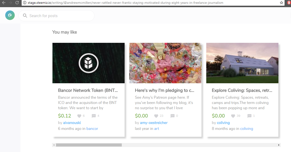 The stage.steemiz.io website has a suggestion feature, in which we can see posts similar to the post we are currently reading.