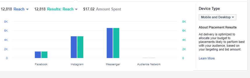 Below you can see this received the best on Messenger which I wasn't totally expecting, but simply because it's a newer place for ads, they are likely to perform better, so it makes sense. I expected Instagram to perform much better than Facebook and I guess this reflects that. In the future I will stick to messenger and Instagram ads!