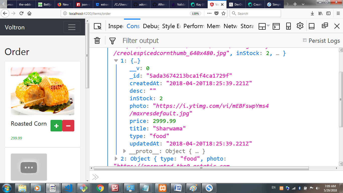 You might be wondering what or how cartItems.title, cartItems.price and so on came about. Let console log the information from the cartItems in the order.component.ts We should get the result below showing an array of objects clicked into the cart, take note of each properties of the items.