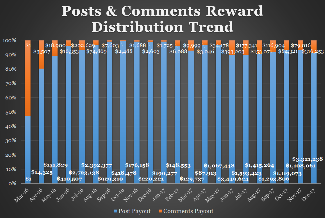 From this chart it can be seen that in the second half of 2016, comments were only getting 2.25% of the reward, this increased to 4.78% in the first half of 2017, and increased further to 8.40% in the second half of 2017.