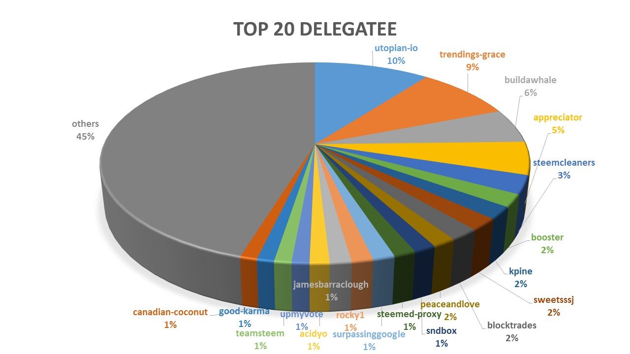 utopian-io is at the top of this list having received 3,700,000++ Steem Power in delegation from a total of 96 delegators, followed by with 3,100,000++ Steem Power delegated by misterdelegation, then buildawhale with 1,900,000++ delegation from blocktrades, minority-report, fminer05, and thedelegator.