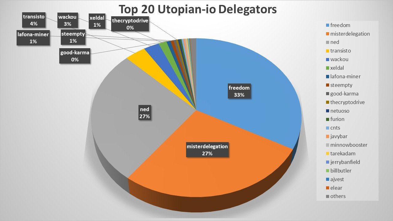 Over 87% of utopian-io's Steem Power is from three major delegators; freedom, misterdelegation, and ned. Recently though, there's been increasing support from individuals pouring in to delegate a portion of their Steem Power to utopian-io in support of their efforts to reward open-source contributors.