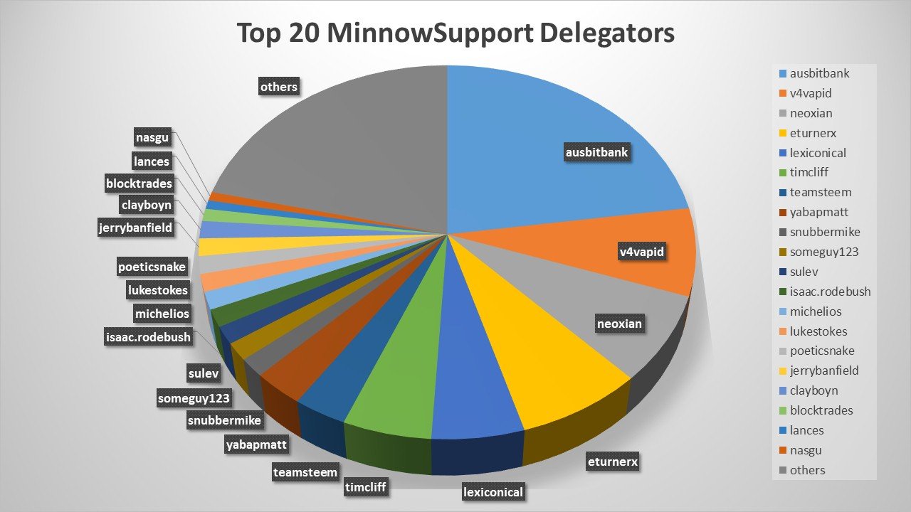 So I am happy to know that unlike the two account above, the top three delegators of minnowsupport constitutes no more than 38% of their total delegated Steem Power. There is currently 231 active delegation to minnowsupport including my menial contribution.