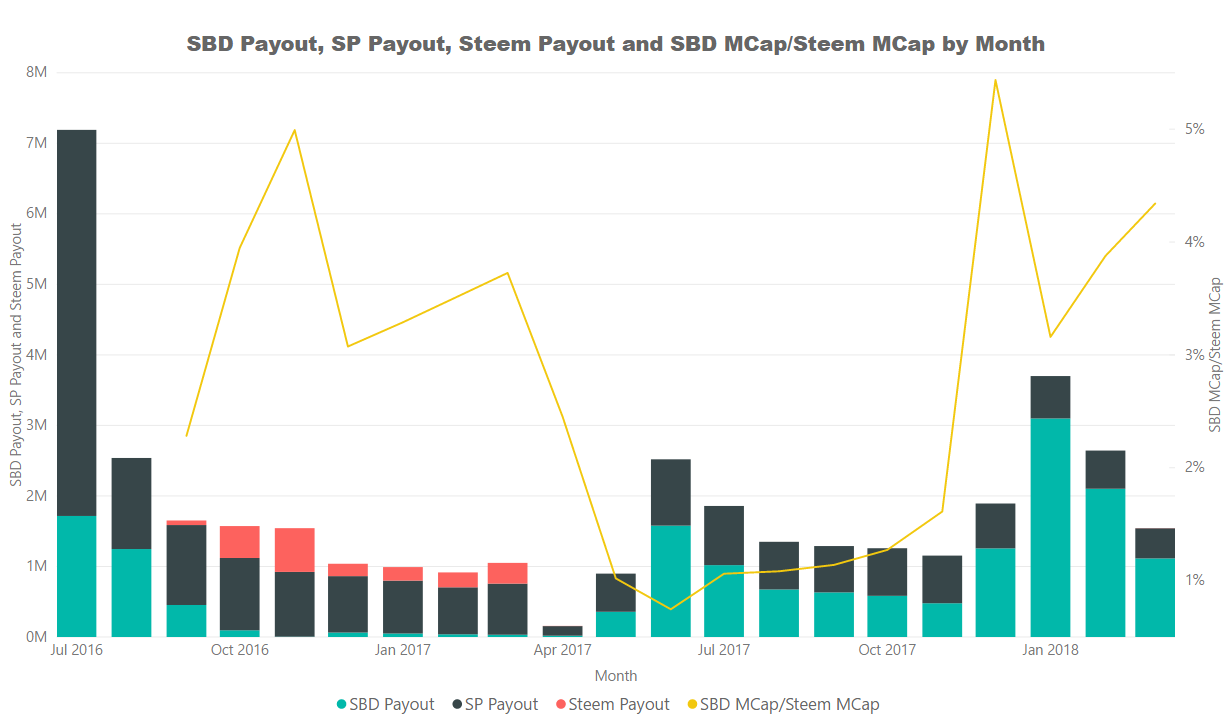 When the prices of Steem Dollar moved significantly above $1 from December 2017 to February 2018, the payout distribution moved to an average of >75% Steem Dollar for those three months.