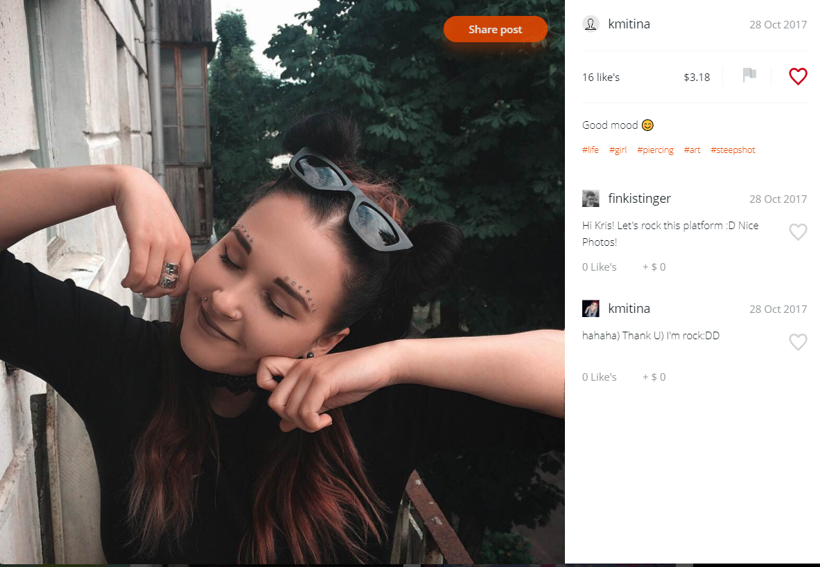 On the screenshot up there you can see the post view on Steepshot: picture on the left, comments on the right, clean design, it's good.