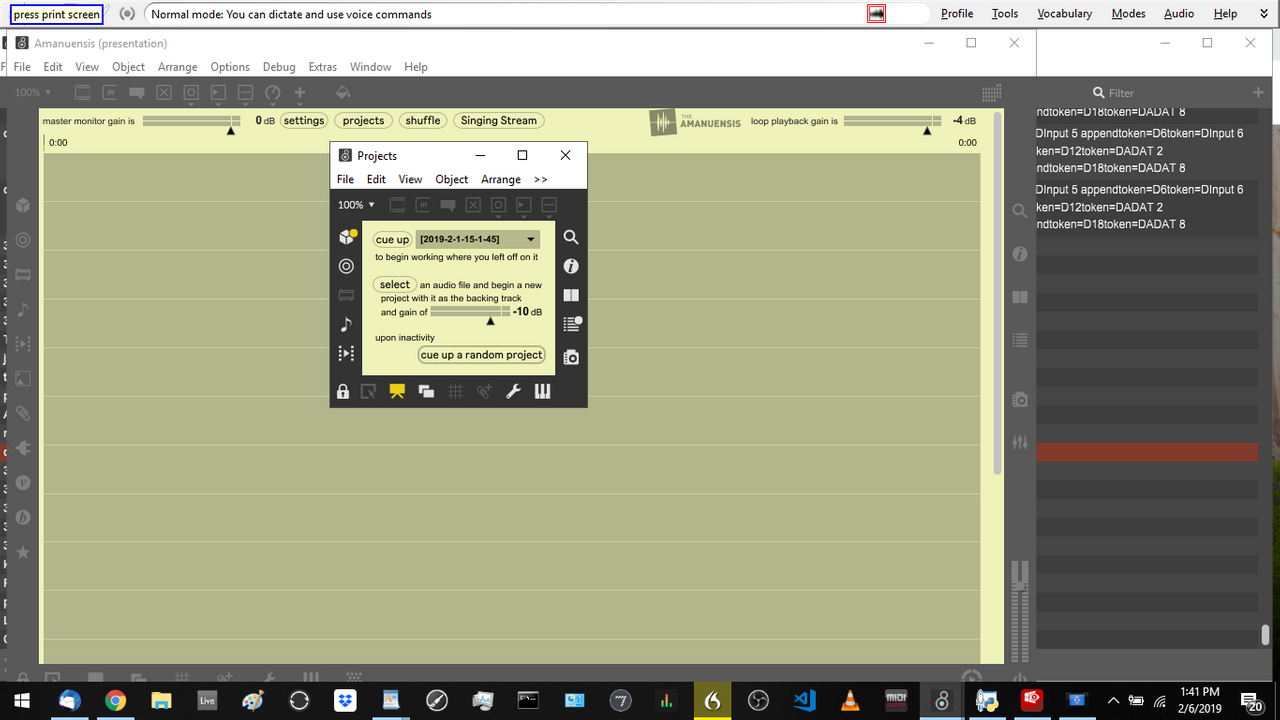 If you hear something that's good but you want to keep working on it via the free-flowing, open-ended strategy of The Amanuensis, you can easily at any time. Just start tapping on a nearby MIDI keyboard or other controller. The Amanuensis doesn't need to be the program with focus, it just needs to receive MIDI for you to play with it. It's entirely possible to rig up custom sensors or buy a product that can turn your idle finger-taps into MIDI as well, meaning you can write songs without conscious effort the entire time you're working or doing whatever else on your computer.