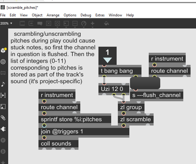 the new scramble_pitches subpatcher in midiports.maxpat, complete with commenting