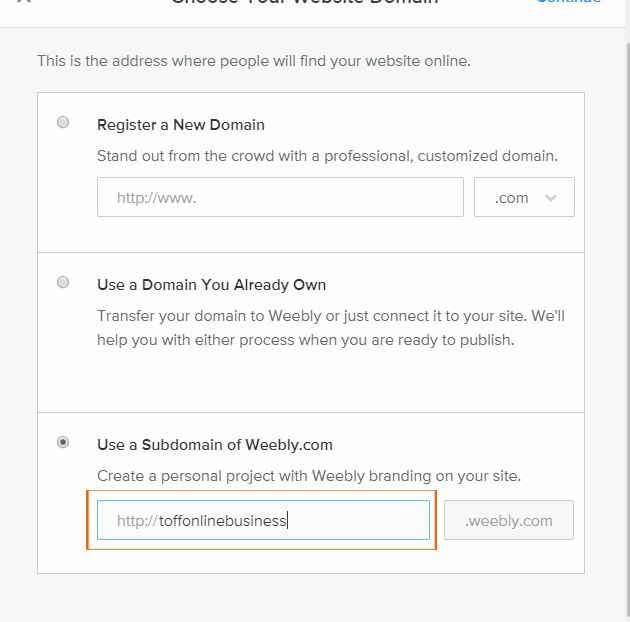 This is the address where people will find your website online. You can now choose your domain website. If you want to buy a domain choose to. Register A new domain. If you have a domain you can use your domain and if you want to free choose the sub domain of weebly.com