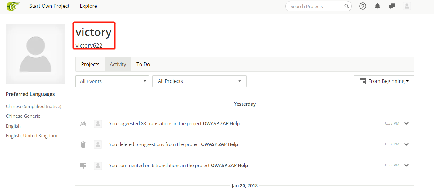 This is already part 17 of my translation for this project so I am very familiar with terms that the project owner uses. I keep all the specific items in this project consistent. I am sure the sentences I translated make Chinese users can understand immediately without spending too much time on them. Notice that all the programming functions' name I kept them with English words since they are codes. There are also some mistakes made by the owner of this project, I wrote comments to wait the owner fix them. After I finished the translations, I always recheck what I translated. I modified some defective items, but the translations under my personal activity item do not change to the correct one, please check the correct one by clicking the link if you think there is problem.