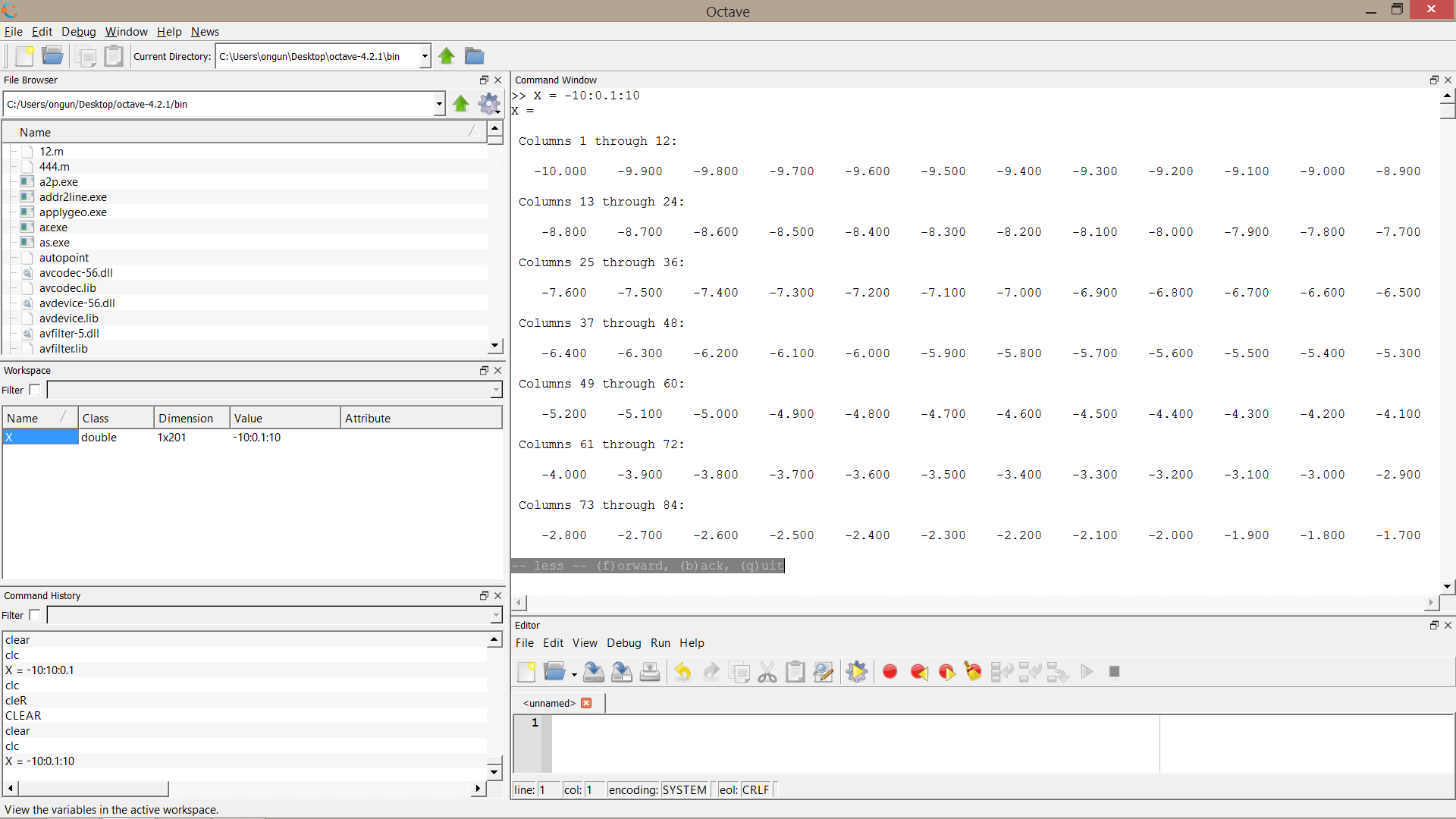 Which will give us a 1x201 matrix consisting of rational numbers from -10 to 10 with an increase of .1