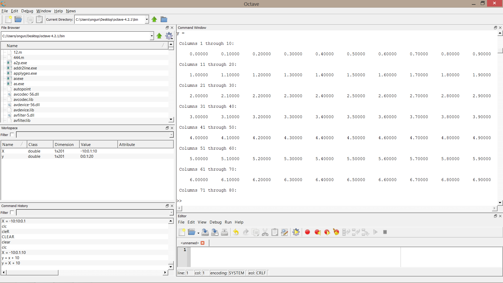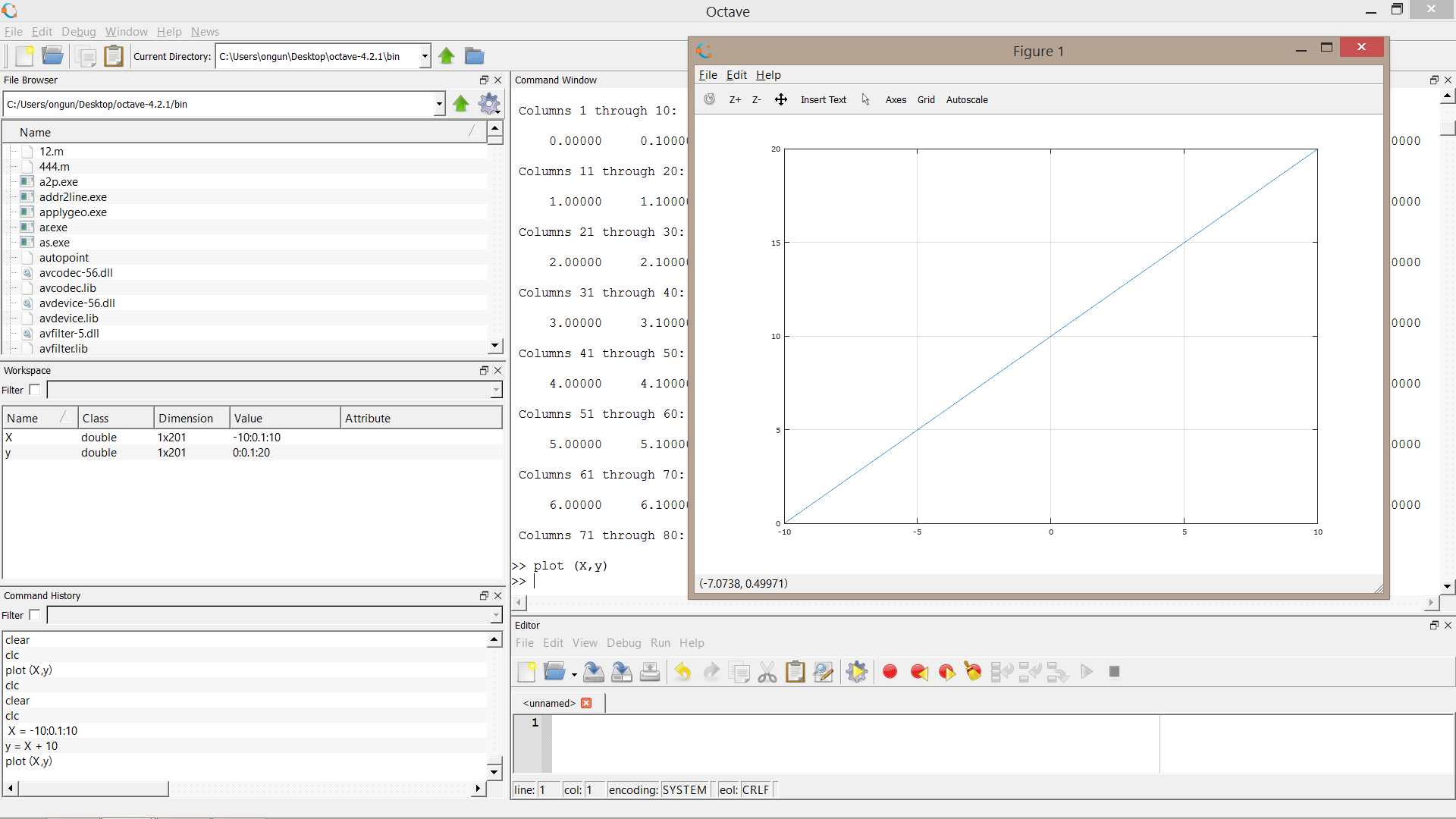 Greetings, in this tutorial we will deeply focus on plotting a function on Octave. To have a background information or if you're wondering what is Octave, i strongly recommend to take a look at my introduction to Octave tutorial. To plot a function in two dimensional cartesian coordinate system we need two variables and an equation showing how dependent these two variables are. To denote these two variables similar to axes, 'x' and 'y' letters will be used.Below are some primitive simple equations that can even be plotted by hand with some basic math,