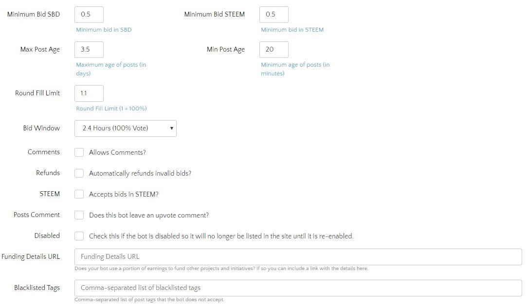 Round Fill Limit - This specifies the limit of how full each round can get for this bot. A limit of 1 means that once the value of the bids sent to the bot equals the total value of the bot's vote (after curation) then the bot will stop accepting bids for that round. This is meant to prevent rounds from becoming too overbid which can lead to a large loss for everyone in the round.