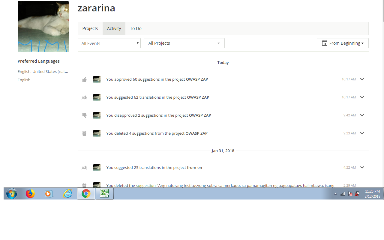 Screenshot of my Crowdin Activity Page with some of my recent translations for this project.
