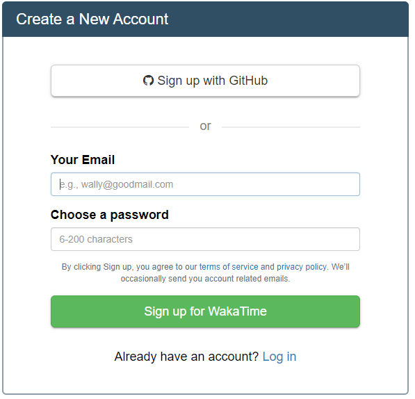 Wakatime is an easy to use plugin. It does not require any extra knowledge for its usage. New users are required to register before given access to use wakatime. You can either register with your email and password or simply sign up with your Github account. This will require authorization from Github to allow wakatime. Once you register, you will be asked to set up your IDE.