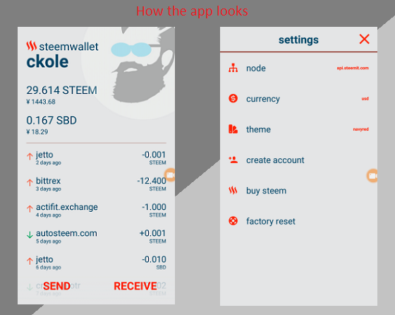Steem wallet is an open source app built to ease transfer and receiving of Steem / SBD. It is also built to monitor any account balance and recent Steem transactions. You can log in with your key or password and transact by sending Steem or SBD to anyone by signing broadcast messages with your key. Steem Wall is a secure wallet. It never access or holds users fund. Using the Steem wallet has been a nice experience. However, I believe more can be done to improve users experience. Getting information about Steem and SBD is done outside the wallet. I believe it would be best if every info of these tokens are within the app's confinement. Part of the apps component that I will focus on is the settings.