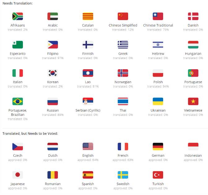 스크린샷은 지금 글 쓰며 찍은거라 몇 번째로 완료된지는 모르겠네요. 지금은 무려 38개 언어로 번역된 상태이고, 스크린샷에는 안나왔지만 14개 언어의 번역이 더 진행 중 입니다.